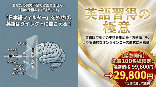 最高峰の英語習得法が、今であれば70%OFFで購入できます。